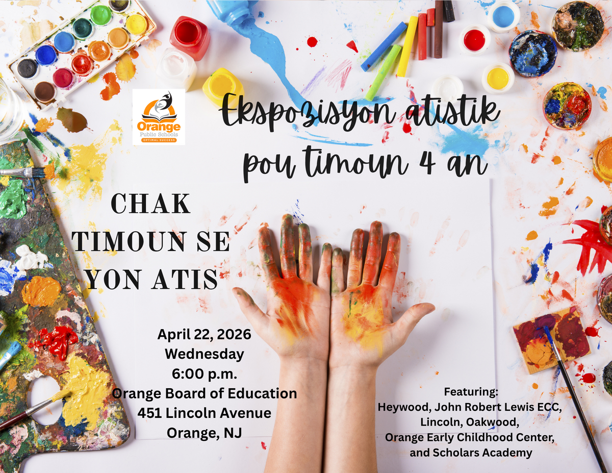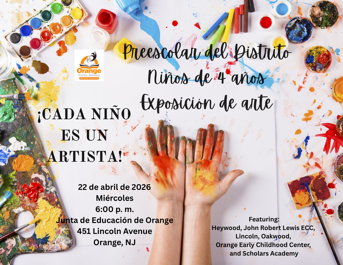 Come join us on Wednesday April 22, 2026 @ 6PM for our PreK 4 Art Show, which will highlight works of art created by our magnificent youngsters. The art show will be held at the Orange Board of Education Building, located at 451 Lincoln Avenue in Orange.
